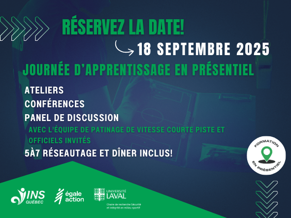 Ne manquez pas la journée d’apprentissage en présentiel du 18 septembre! Une journée enrichissante comprenant: des ateliers, des conférences, un panel de discussion avec l’Équipe de Patinage de vitesse courte piste et officiel·les invité·es, ainsi qu’un 5 à 7 réseautage.